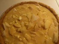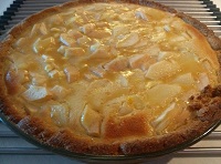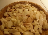 4)      Die Birnen in die Form legen, die Eiermasse darüber verteilen und die fertige Tarte für ca. 25 Minuten backen, bis sie eine schöne, goldbraune Farbe hat.